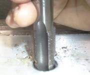 TAP THE HOLE Tap the hole with the wrench provided. There is a pilot at the front of the tap to help guide it straight into the hole. Use contact or break cleaners to thoroughly clean out any remaining chips and oil. |