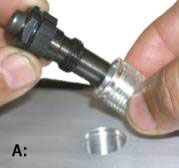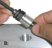 Ream the hole picture C: until black "Stop Collar" touches head. When you start getting close to the stop collar coming in contact with the head, you will want to clean the chips from the reamer so you will have a positive stop on the head without having any chips interfering. The reamer should spin very freely when the collar touches the head. |